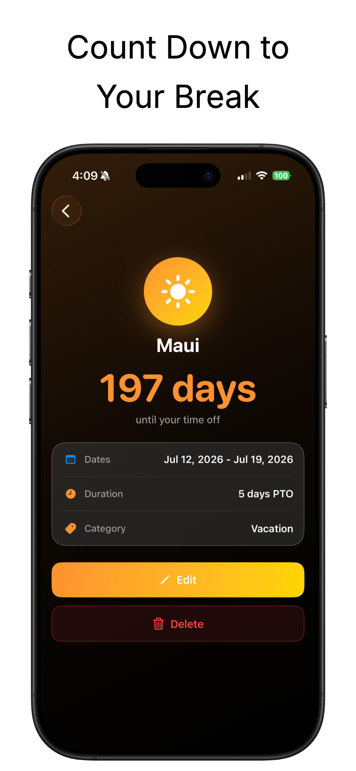 Turn time off into something to look forward to. See a live countdown to your next break, plus exactly how many PTO days it uses.