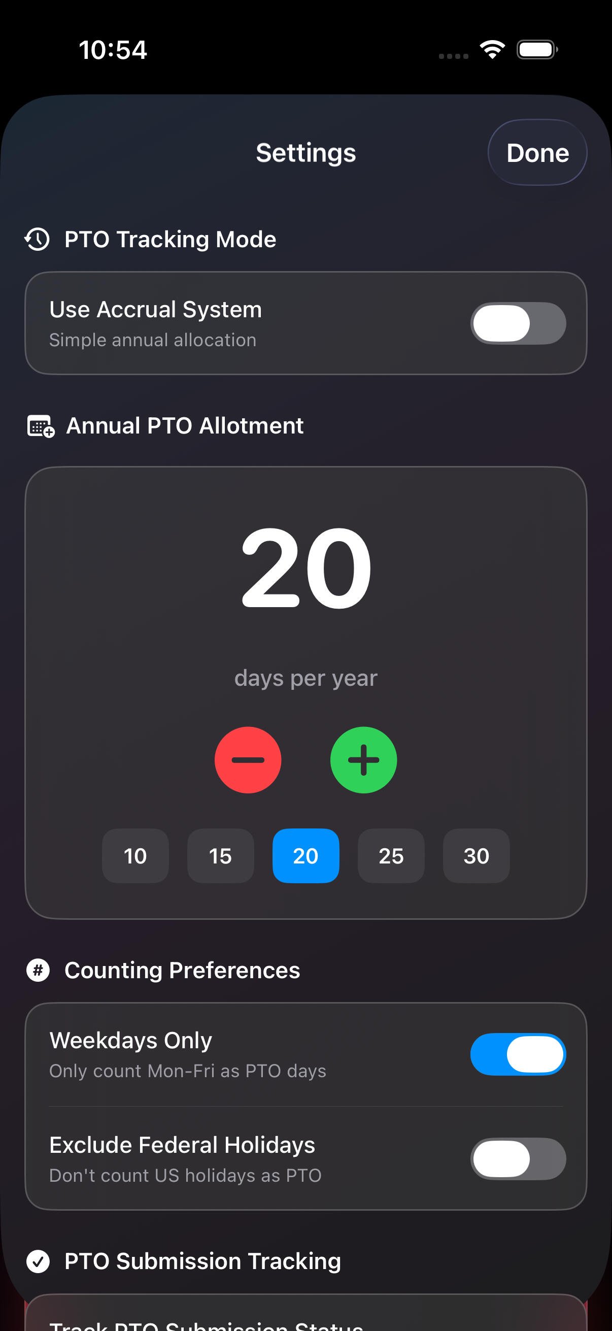 Never guess how much time you have left. Track your annual PTO balance automatically, with smart rules for weekdays and holidays.