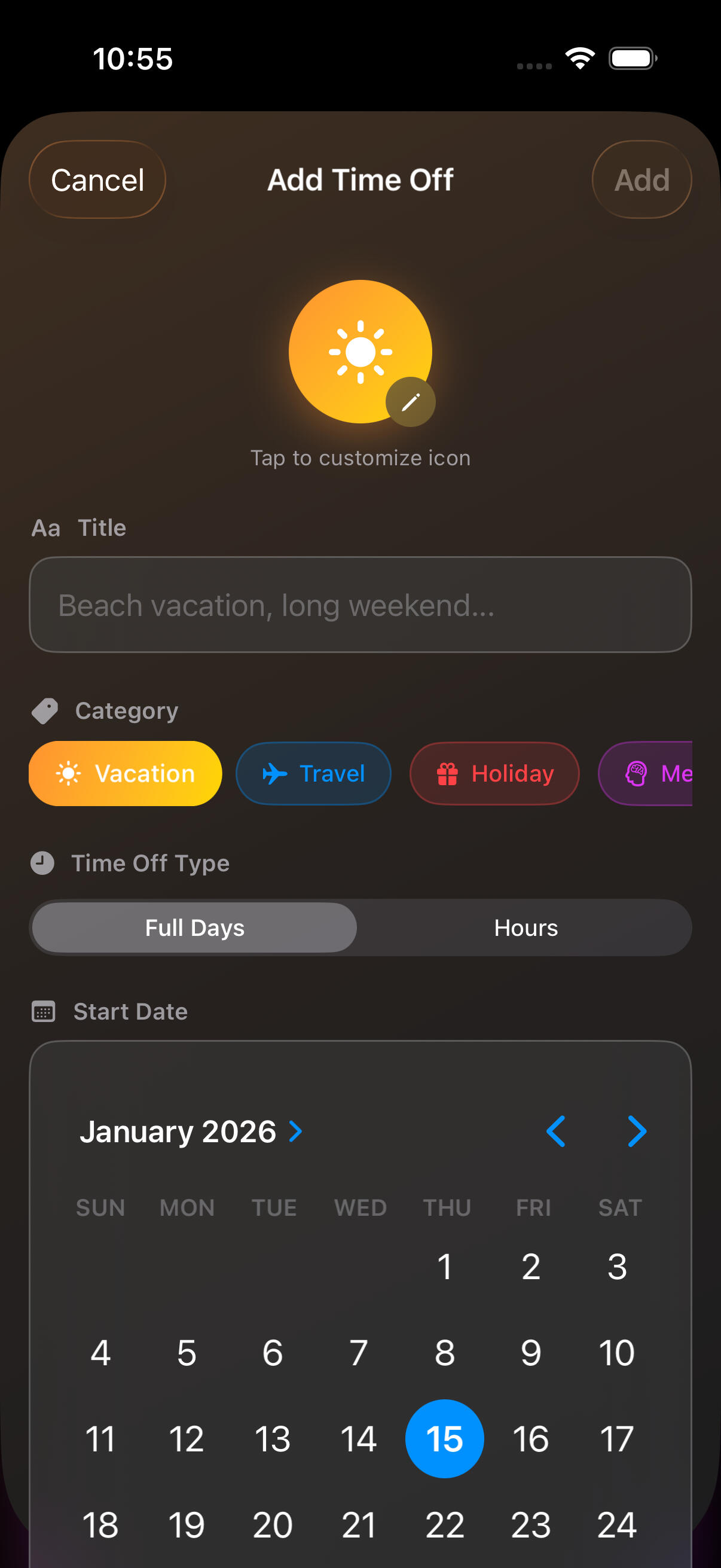 Add vacations, long weekends, or personal days in just a few taps.