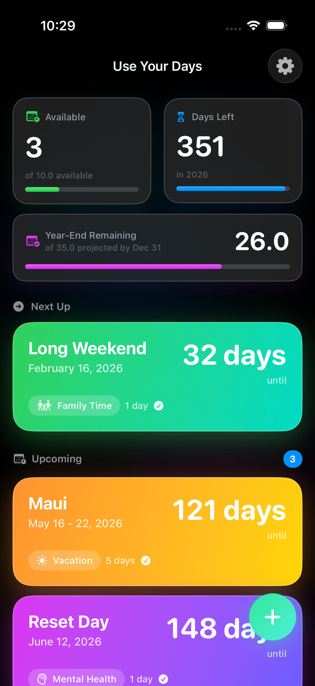 Use Your Days helps you track your vacation days, personal time, and all the breaks you deserve with beautiful countdowns that build excitement for every moment away from work.